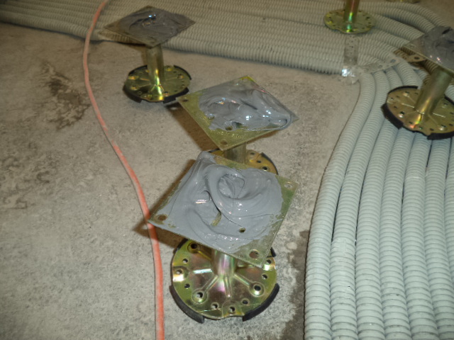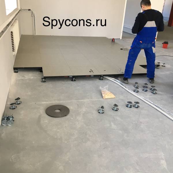 Если говорить о технологии монтажа фальшпола, в начале работы на основание пола монтируются небольшие ножки-подставки для плит. При этом данные опоры, можно собственноручно регулировать по высоте.
