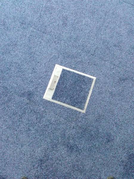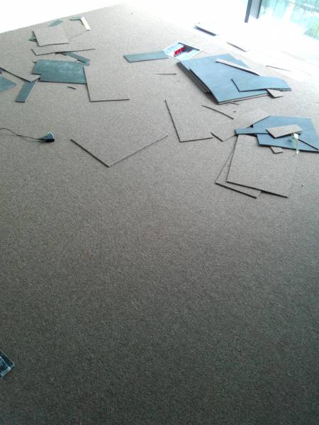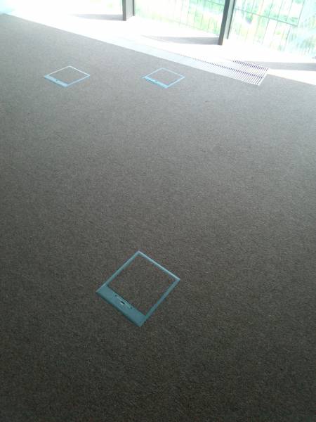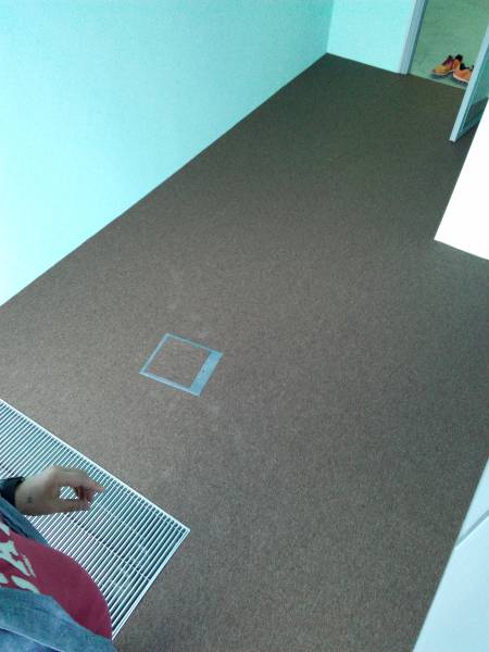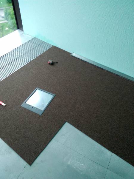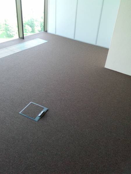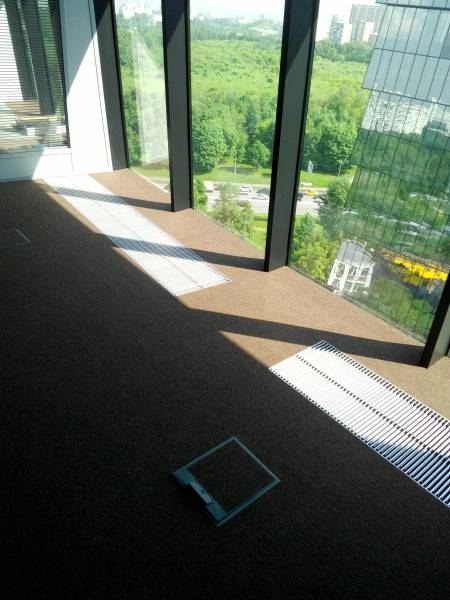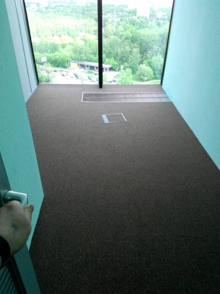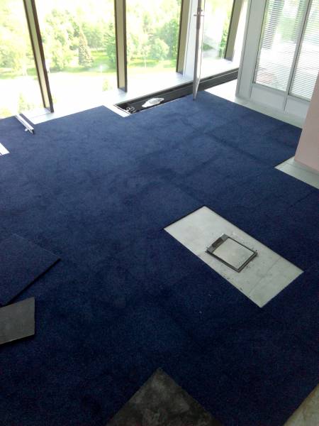 Финишное покрытие фальшпола. Используется ковровая плитка RusCarpetTiles Аудитория ЦПК "Газпром" Офис в Бизнес центре "Лотос". Высота пола 160мм. Пол 600х600х30мм. Нагрука 1100 кг/м2. Вес конструкции 30 кг.м2